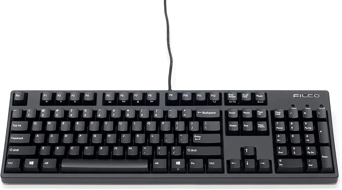 Flico’s Majestouch 3 Full Size (14.1 x 5.4 x 1.4 in., 104 keys) features Cherry MX Blue switches, double-shot PBT keycaps, and N-key rollover. With a steel plate, matte black finish, and 6.6-ft cable, it’s ideal for gaming or typing, backed by a 1-year warranty.